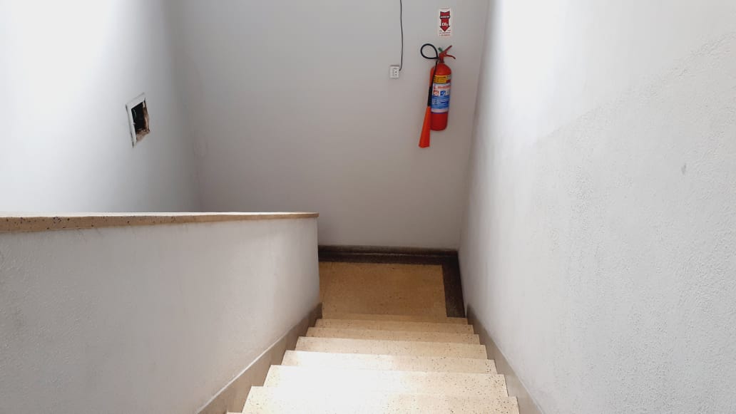 Sala comercial ampla e bem iluminada em prédio com elevador.